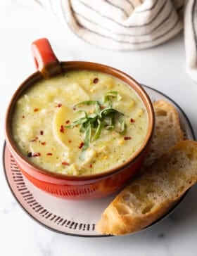 - Serve with a Side – I don’t know about your household, but around here, it’s practically a rule that soup has to be served with some sort of bread! This creamy soup is delicious for dunking in slices of toasty baguette or a hunk of any warm, crusty bread.