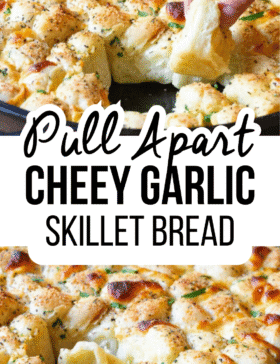 Simple Cheesy Garlic Pull-Apart Bread recipe made in a skillet! This tantalizing party snack makes little bites of cheese bread perfect for dipping.