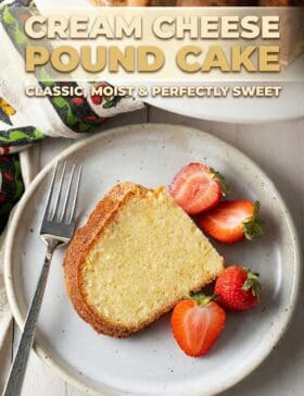 Ready to learn how to make a perfect pound cake? Find the full Cream Cheese Pound Cake recipe with ingredient proportions, detailed instructions, and video tutorial in the printable form at the bottom of the post.