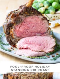 Using a leave-in meat thermometer eliminates the chance of overcooking this standing rib roast recipe. Perfection every single time! If you use an oven thermometer, you cannot mess this up. It’s basically fool-proof.