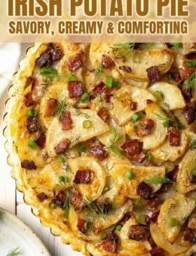 The layers of potatoes bake with a drizzle of heavy cream, so they soften into decadent folds of silky goodness. Irish Potato Pie makes an irresistible St. Paddy’s Day side dish or appetizer.