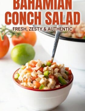 But even if you aren’t able to make a trip to the Caribbean, it’s easy to get a taste of the islands right in your own kitchen. We make this Conch Salad recipe for summer parties to serve with Caribbean cocktails like Bahamian Punch and everyone always raves about how delicious it is. I couldn’t agree more!