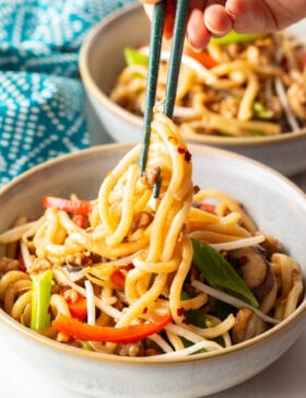 Authentic Yaki Udon Recipe – This delicious one-pan Japanese dish features tender stir fry vegetables, ground chicken and udon noodles, all combined in a zippy soy and citrus sauce. Chicken Yaki Udon is easy to customize and cooks in under 30 minutes!