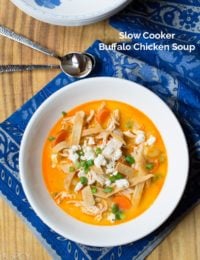 We love Slow Cooker Buffalo Chicken Soup, possibly even more than buffalo wings, because as long as you don’t pile your bowl with additional tortilla strips and cheese, you can enjoy it guilt-free!