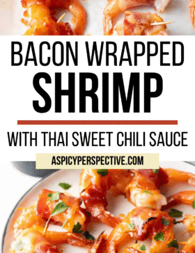 These plump, tender and succulent bacon wrapped shrimp are basted with Thai sweet chili sauce for a burst of sweetness and spicy flavor in every bite! This easy no-fail recipe to make baked shrimp wrapped in bacon is perfect for parties and any occasion.