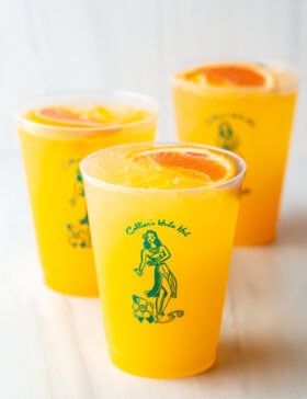 In this homemade version of a canned SunnyD Vodka Seltzer, the cocktail only gets its sweetness from the orange beverage. There’s no additional sweeteners needed here.
