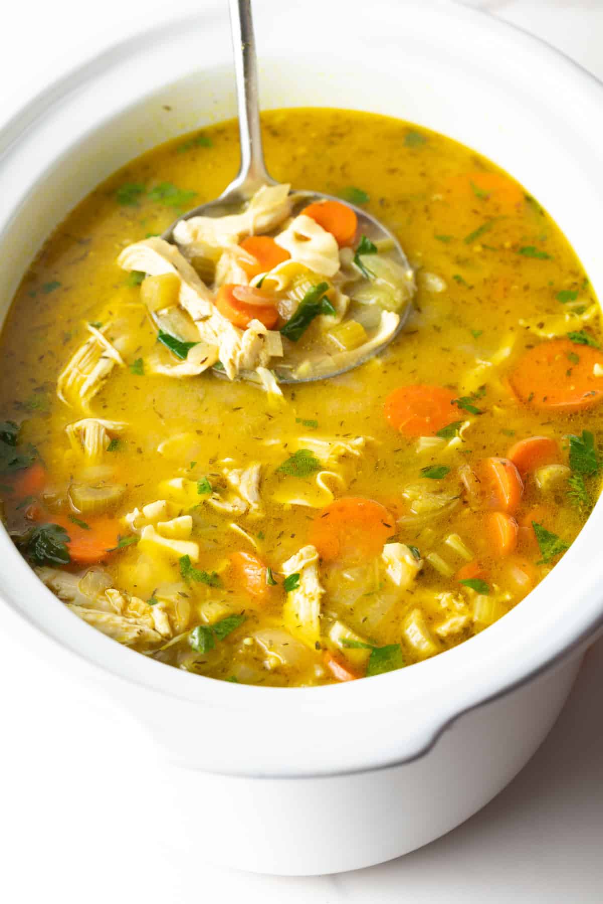 I’ve always considered chicken noodle soup a go-to recipe whenever I’m not feeling well, whether it’s a winter cold or you’re simply in a crummy mood. Because no matter the season, or how I’m feeling, chicken soup loaded with thick egg noodles in a warm, flavorful broth is sure to make me smile! I have a well-loved homemade chicken noodle soup recipe here on the site. It’s easy to make, and so satisfying. However, sometimes I want to throw everything in the crockpot and head out the door, only to come home later to a hot, steaming dinner. Today’s crockpot version is just the thing! It has the same incredible depth of flavor as our stovetop recipe, with a lot less fuss!