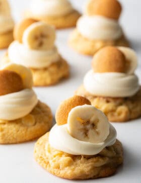 - Cut another banana into thin slices right when you are ready to decorate (so it doesn’t brown). Gently stick one slice of banana and a mini Nilla wafer into the frosting of the banana pudding cookies.