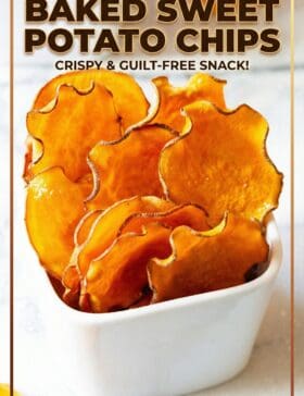 So today I’m sharing my Baked Sweet Potato Chips Recipe. It’s super simple to make, requires only 3 ingredients, and tastes like better than store-bought chips, because they’re fresh!